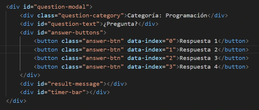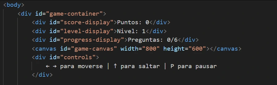 <head>: Configura el título de la página, los estilos y los scripts necesarios.<body>: Contiene el contenedor del juego, la interfaz de usuario (barra de puntuación, temporizador) y el modal de preguntas.