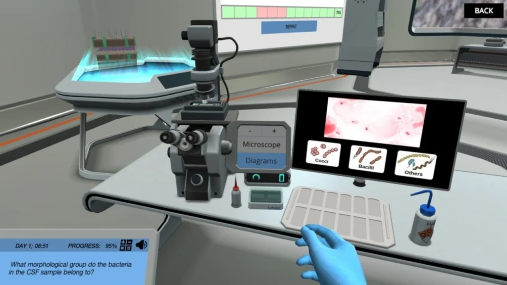 - Medicina: Los estudiantes practican procedimientos quirúrgicos complejos en entornos virtuales seguros, lo que reduce riesgos y aumenta la confianza. La retención del conocimiento mejora en un 25% frente a métodos tradicionales.