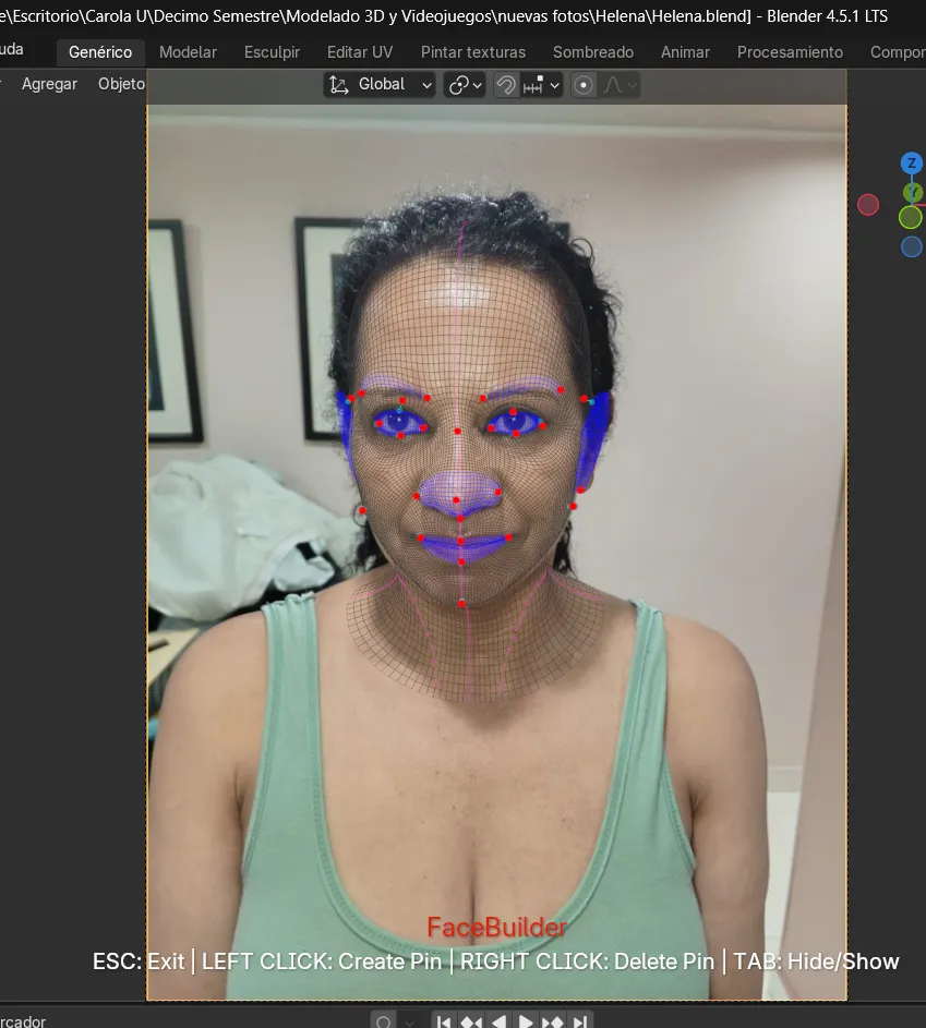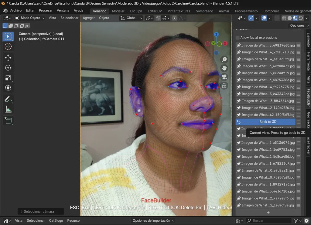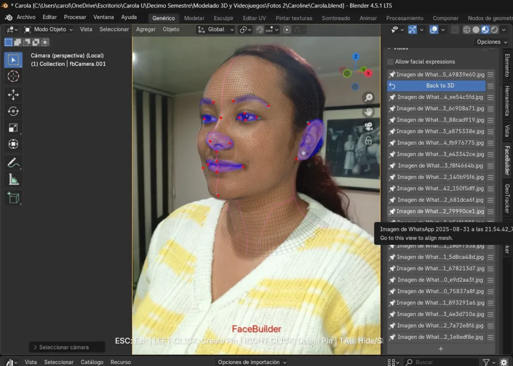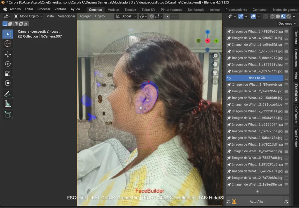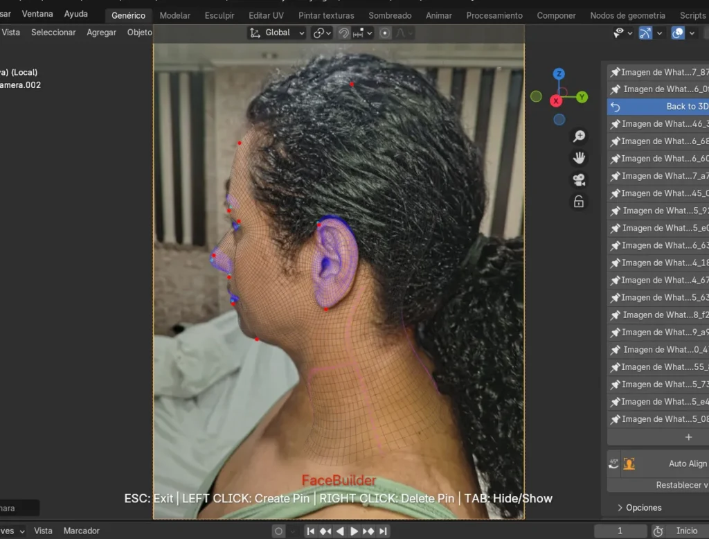 Durante la generación de la texturización también surgieron dificultades, pues en algunos casos las imágenes no se aplicaban correctamente y el rostro quedaba con ciertas deformaciones. Incluso, en una de las fotografías los pines no se generaron de manera automática, lo que representó un reto adicional al tener que ajustarlos manualmente para cuadrarlos de forma correcta. Esta experiencia permitió comprender mejor el funcionamiento de la herramienta FaceBuilder, aprendiendo no solo a usarla, sino también a intervenir manualmente cuando el sistema no ofrecía los resultados esperados.