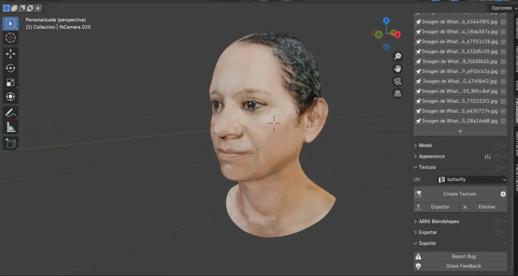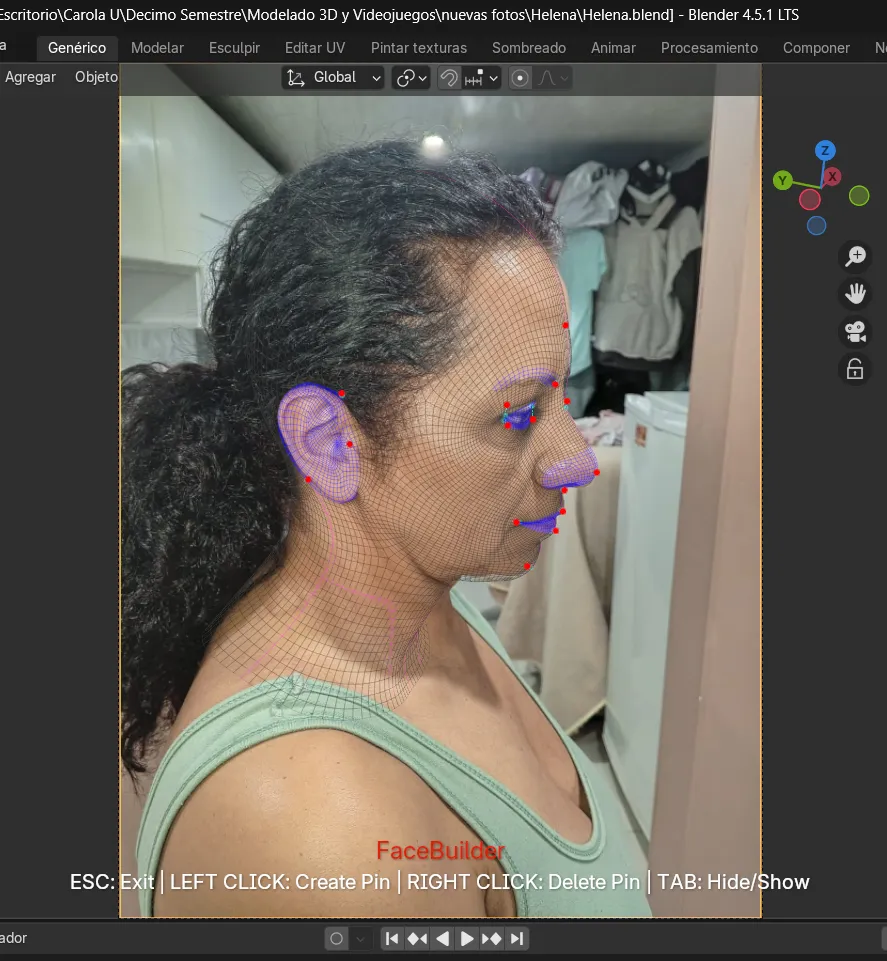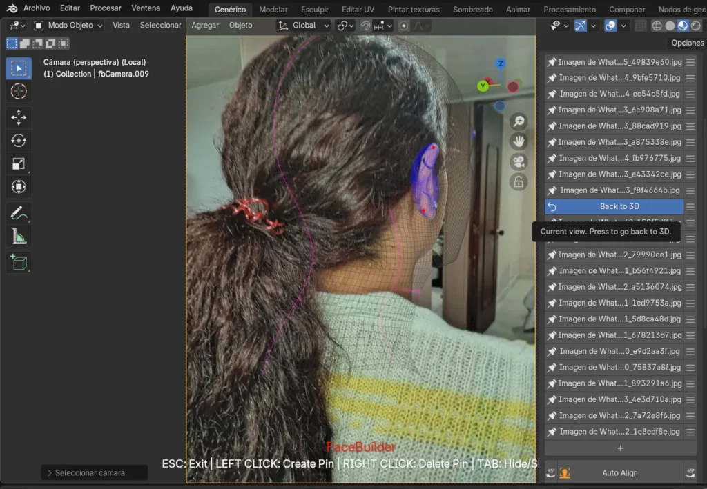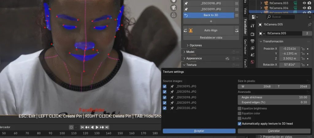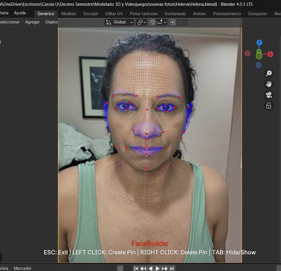 Durante la generación de la texturización también surgieron dificultades, pues en algunos casos las imágenes no se aplicaban correctamente y el rostro quedaba con ciertas deformaciones. Incluso, en una de las fotografías los pines no se generaron de manera automática, lo que representó un reto adicional al tener que ajustarlos manualmente para cuadrarlos de forma correcta. Esta experiencia permitió comprender mejor el funcionamiento de la herramienta FaceBuilder, aprendiendo no solo a usarla, sino también a intervenir manualmente cuando el sistema no ofrecía los resultados esperados.