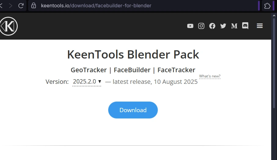 Para comenzar a moldear el rostro, debemos descargar el complemento KeenTools FaceBuilder para Blender. Para ello, ingresamos a la página oficial de KeenTools, en la sección de FaceBuilder para Blender, y descargamos la versión más reciente.