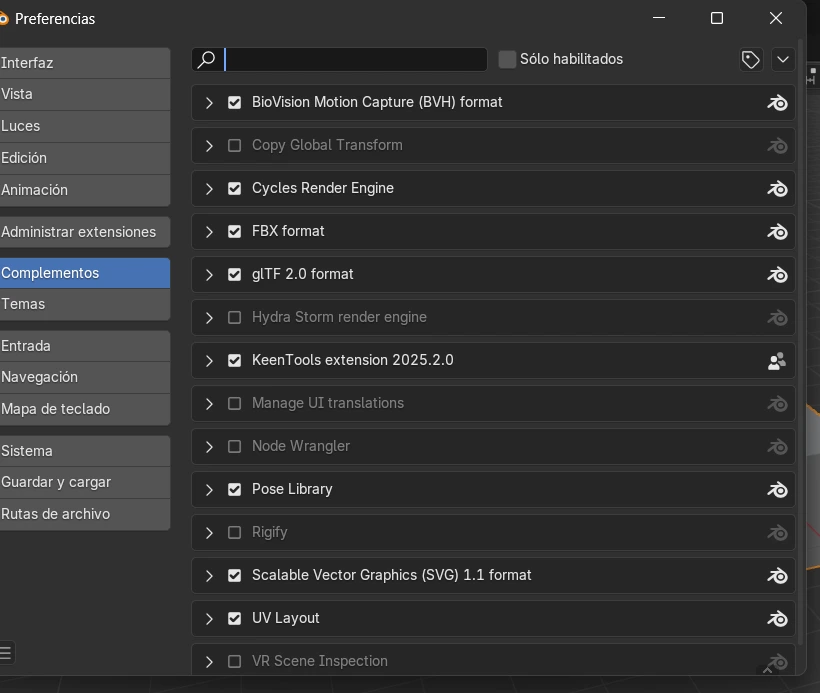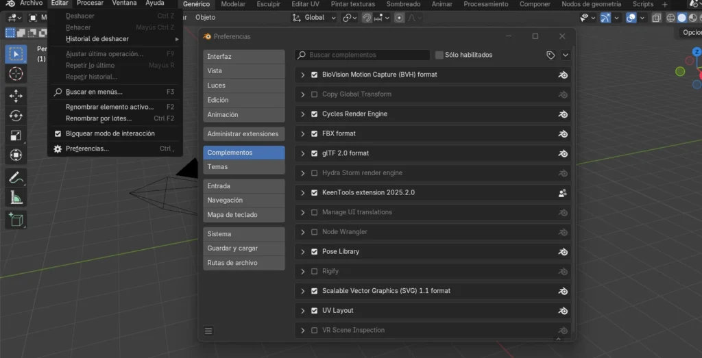Ahora, para implementarlo en Blender, vamos a la opción Editar → Preferencias, y luego a la sección de Complementos. Esto abrirá una nueva ventana.