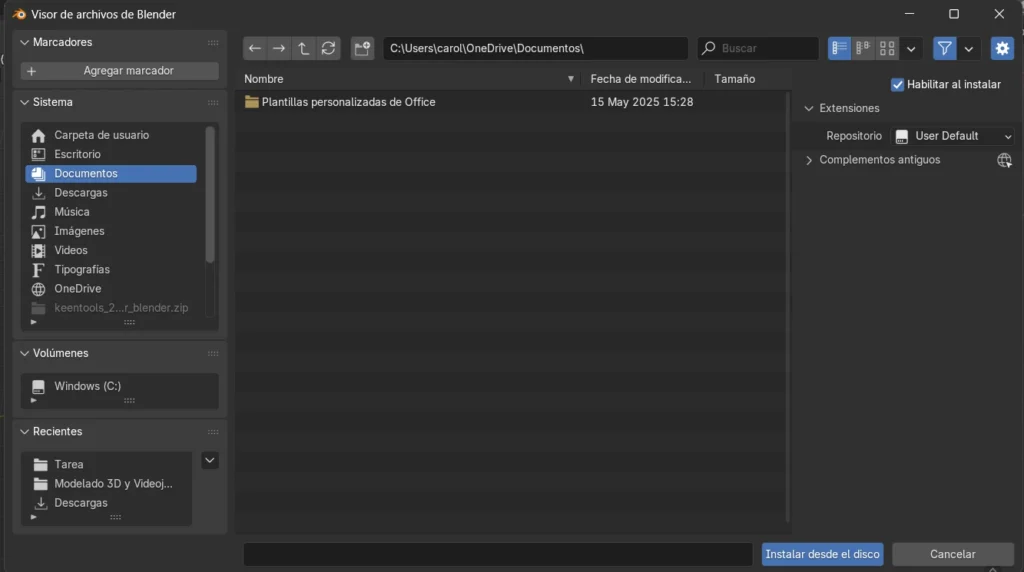 Hacemos clic en Instalar, buscamos el complemento que descargamos previamente y procedemos a instalarlo.