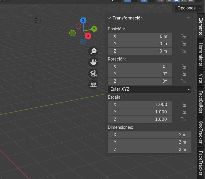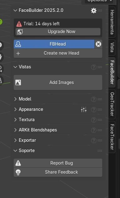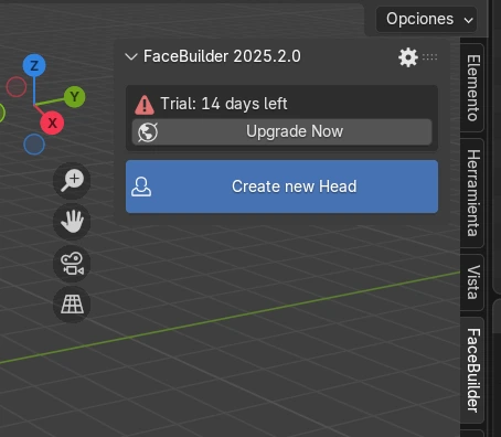 Para empezar, verificamos que el complemento esté instalado. Luego, al oprimir la tecla N, podemos visualizar el panel donde aparece FaceBuilder. Desde allí seleccionamos la opción Crear nueva cara.