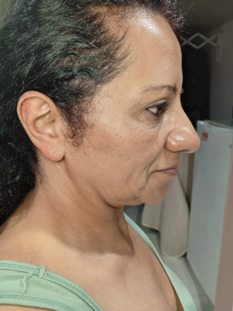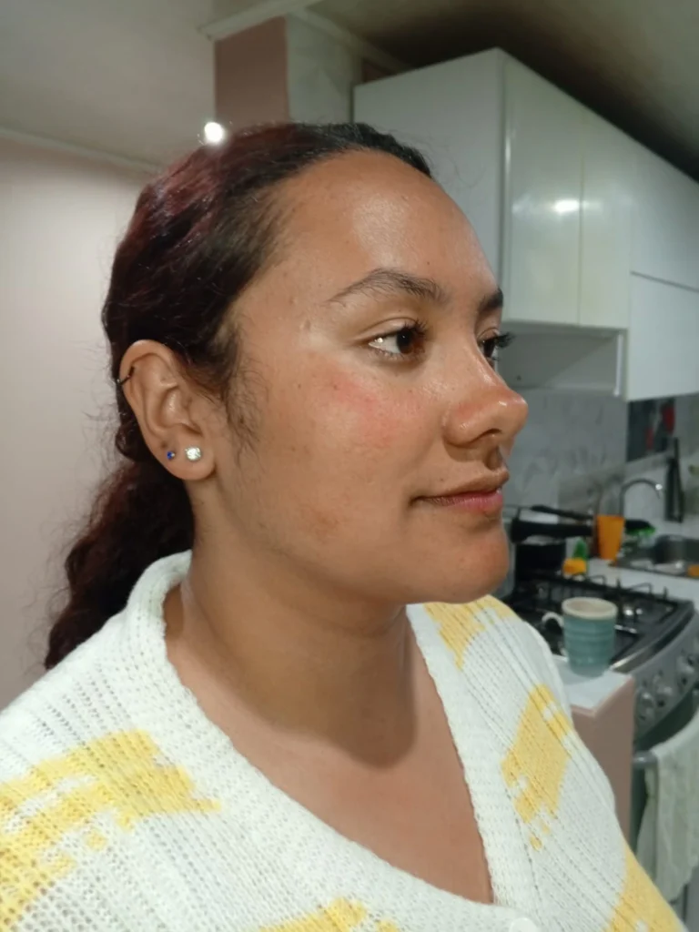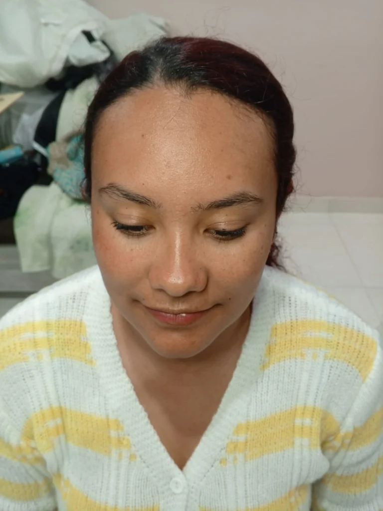 Allí aplicamos un color uniforme en toda la superficie del rostro, procurando cubrir de manera completa y homogénea para que no queden zonas sin color o con diferencias notorias de tonalidad.