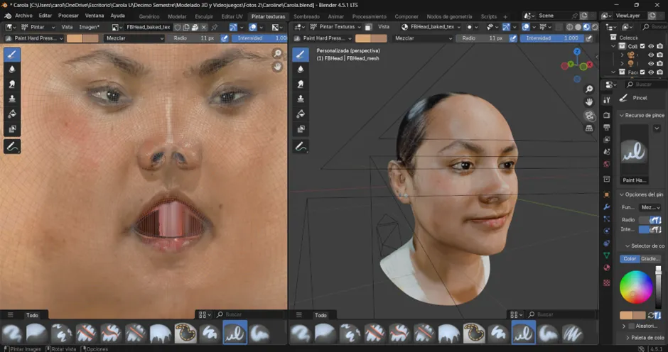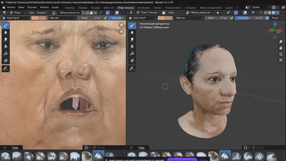 La práctica incluyó desde la toma inicial de fotografías — capturadas en diferentes posiciones como de frente, perfil y vista superior e inferior— hasta la instalación del complemento, la creación del modelo base, el ajuste de pines y la generación de texturas. A lo largo del proceso se identificaron retos como la correcta alineación de los pines, la necesidad de realizar ajustes manuales cuando la herramienta no reconocía bien ciertos rasgos y la dificultad de obtener resultados uniformes en diferentes rostros.