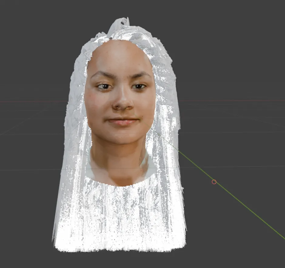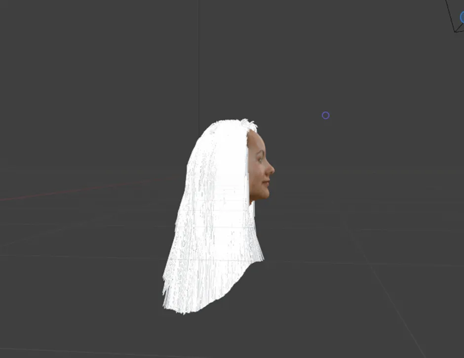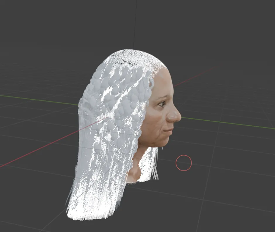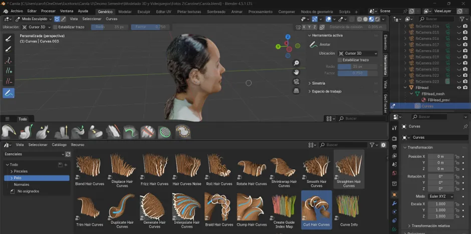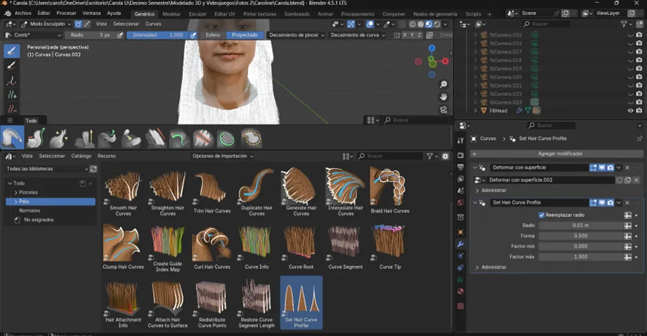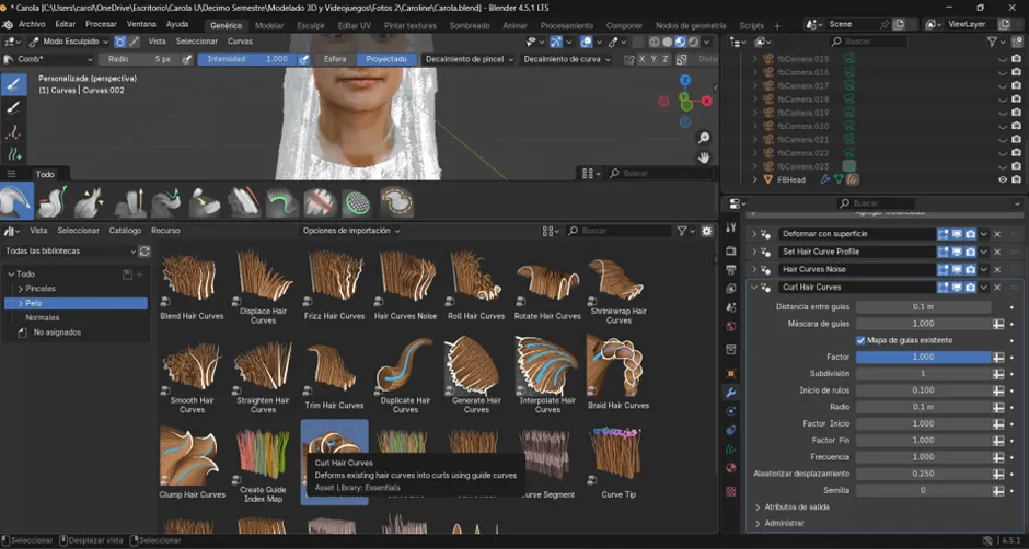 A continuación, se aplicó la herramienta Interpolate Hair Curves, con la cual las guías se multiplicaron para aumentar la densidad del cabello. Posteriormente, se utilizó Curl Hair Curves con el fin de otorgarle la forma rizada característica. Finalmente, se definió el grosor tanto en la raíz como en la punta, estableciendo así la base del cabello crespo sobre la que se continuarían los siguientes ajustes y detalles.