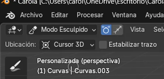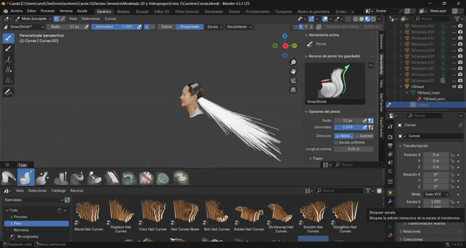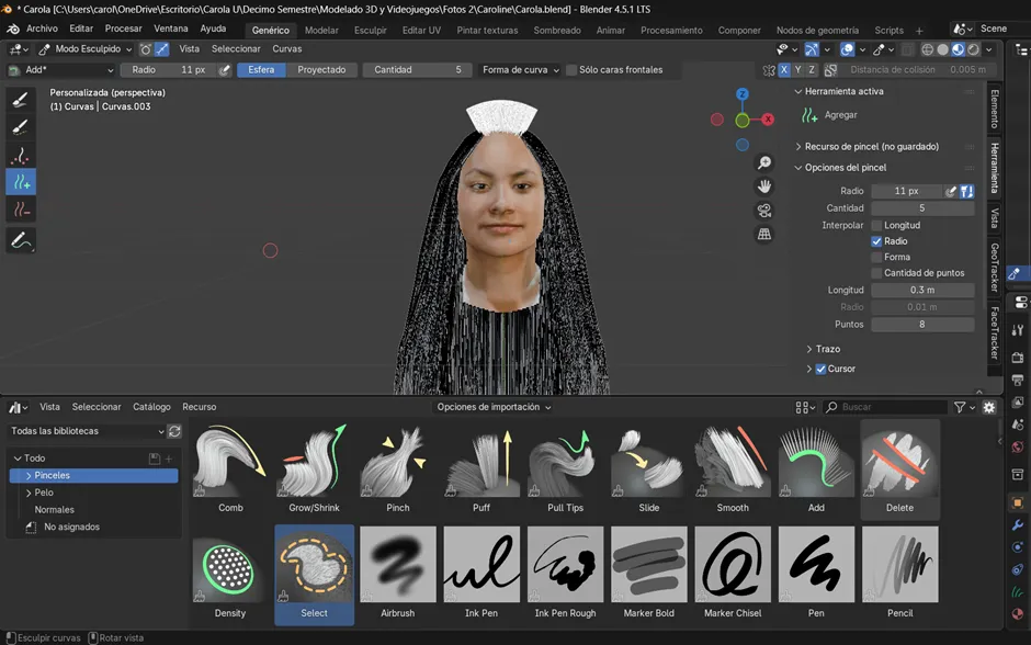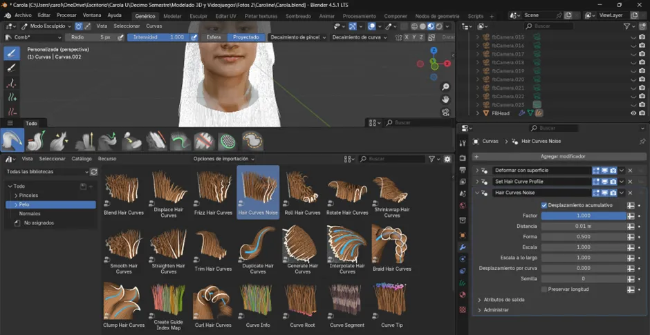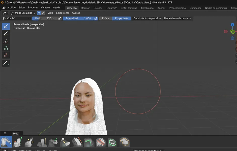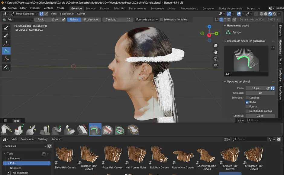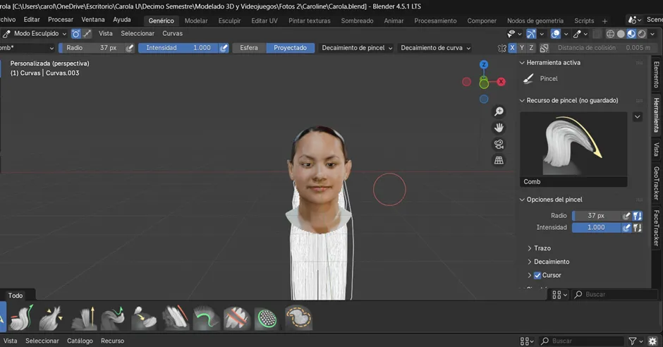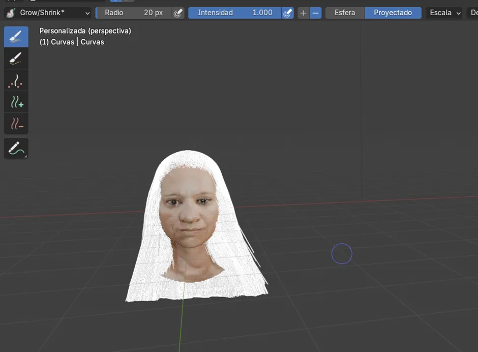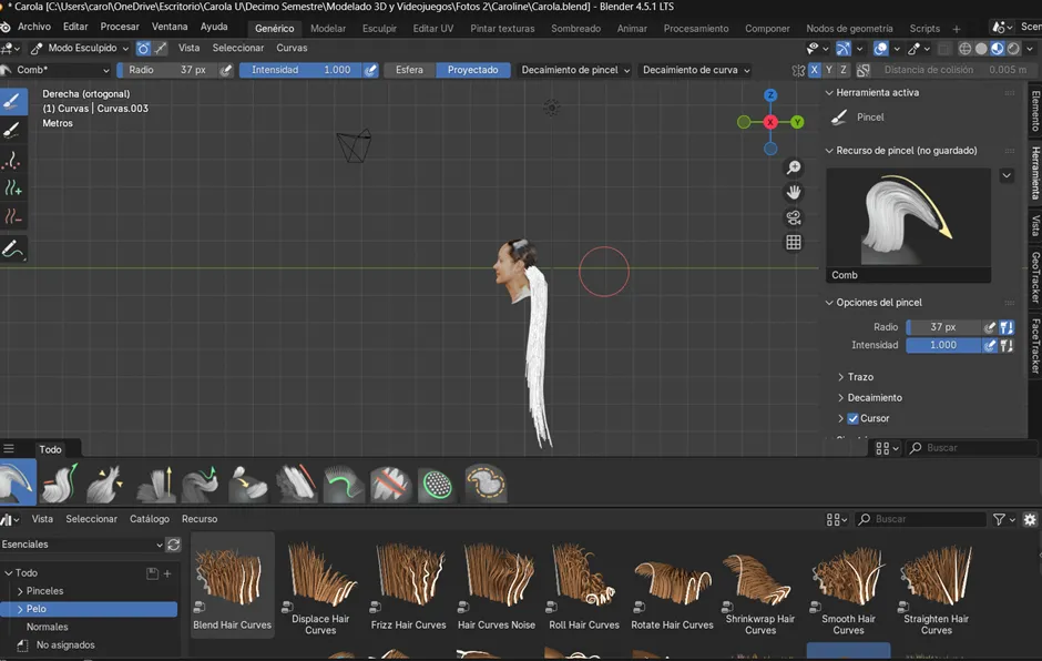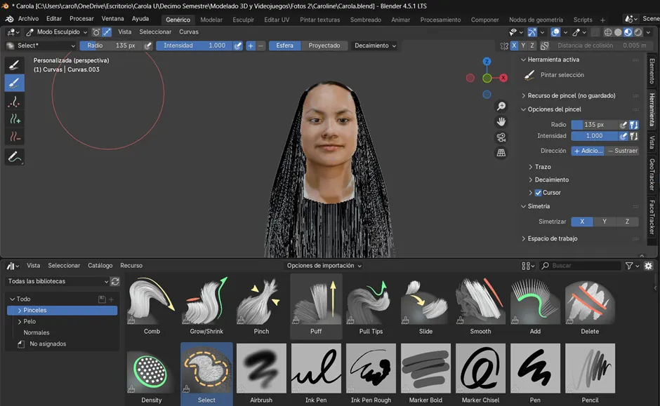Ahora cambiamos al modo Sculpt en el objeto de cabello, donde comenzamos a dibujar las guías principales del peinado. Primero se activó el método de simetría, con el fin de que ambos costados mantuvieran la misma forma y proporción desde el inicio. Luego, para agregar mechones se utilizaron las herramientas Add y Puff, mientras que con Density se ajustó la cantidad de guías en las zonas necesarias. Posteriormente, con Comb se peinó la dirección de los mechones y con Lengthen se alargaron las áreas seleccionadas. En este proceso también se hicieron ajustes específicos: se agregó un mechón de 20 pelos con un radio de 11, se seleccionó el área que se quería alargar y se fue extendiendo progresivamente. Finalmente, los mechones se acomodaron bajándolos poco a poco hasta darles la forma deseada al cabello.