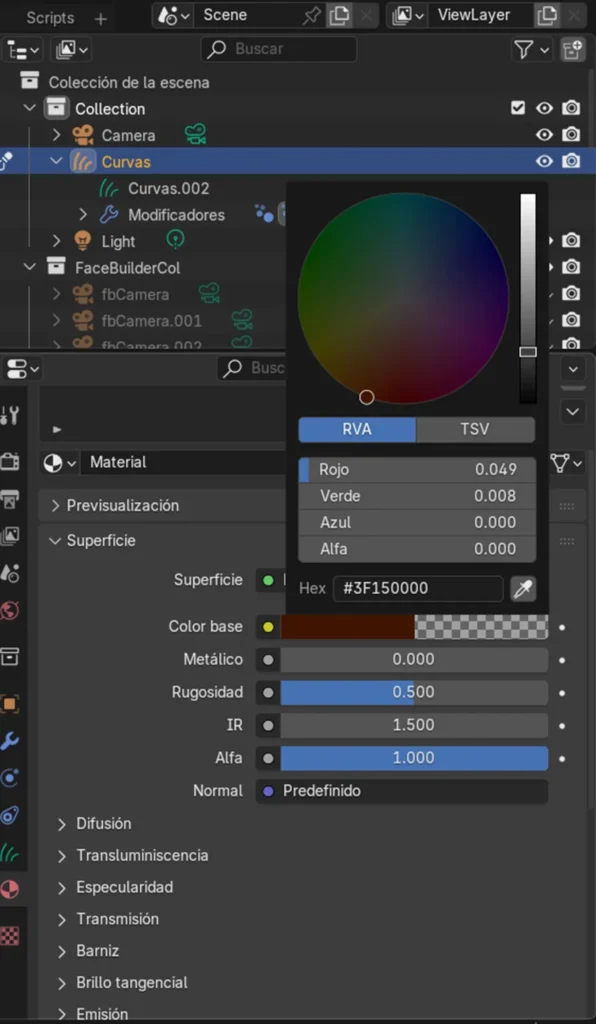 Luego, se accedió al Área de Material, donde se aplicó el color al cabello. En esta etapa se definió el tono deseado para darle mayor realismo al modelo y reforzar la coherencia visual del peinado.