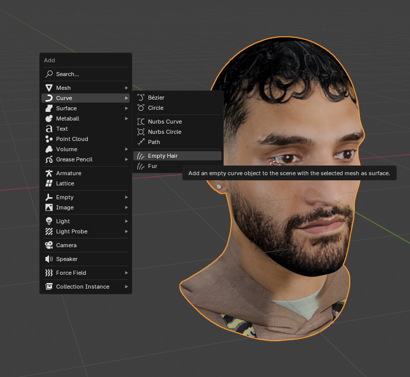 - Para añadir pelo, se debe seleccionar el modelo como objeto activo y de esta manera añadir un Empty Hair.