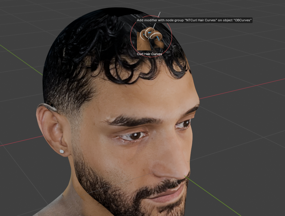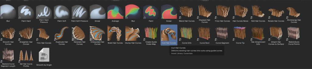 - En el Asset Browser que anteriormente desplegamos deberemos buscar el efecto Curl Hair Curves y arrastrarlo hacia el modelo.