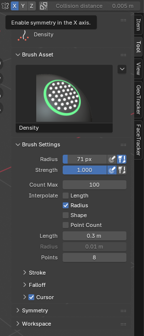 - Una vez añadido el efecto, seleccionaremos el pincel Density, y habilitaremos la simetría, esto nos servirá para añadir pelo en el modelo.