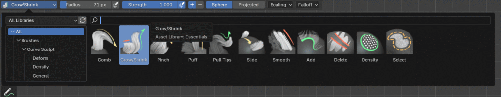 - Para ajustar el largo del pelo deberemos usar el pincel que se encuentra en la pestaña , llamado Grow/Shrink. Además usaremos el pincel Comb para cambiar la dirección del pelo.