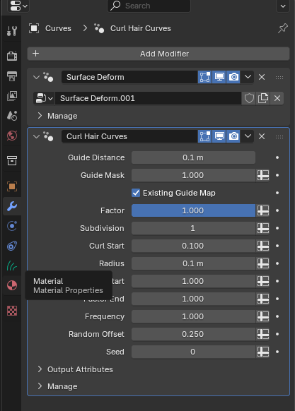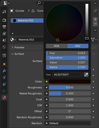- Para finalizar añadiremos un material con la curva seleccionada, simulando el color del pelo.
