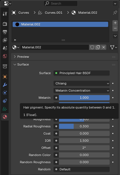 - En las opciones de material cambiaremos la opción de surface por defecto a Principal Hair BSDF.