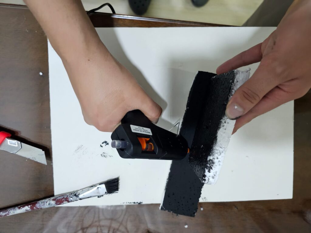 • Poco contraste con el fondo: notamos que la imagen se confundía con el ambiente y no resaltaba. Para solucionarlo, forramos por dentro el cubo con cartulina negra mate y pintamos el icopor con pintura mate negra, lo que ayudó a absorber la luz sobrante.