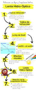 Esta infografía explica de manera clara y visual el fenómeno de la refracción de la luz, enfocándose en su comportamiento en el agua y su aplicación en lentes hidro-ópticos. Se describen conceptos fundamentales como el índice de refracción y la ley de Snell, así como los efectos visuales que generan estos principios físicos. Además, se muestra la relación entre la refracción y su uso en la computación gráfica para crear efectos realistas.