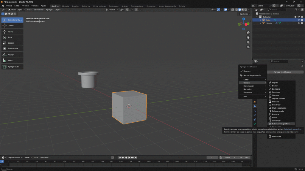 Seleccionamos el cubo y vamos a “Modificadores”, “Generar” y “subdividir superficies”