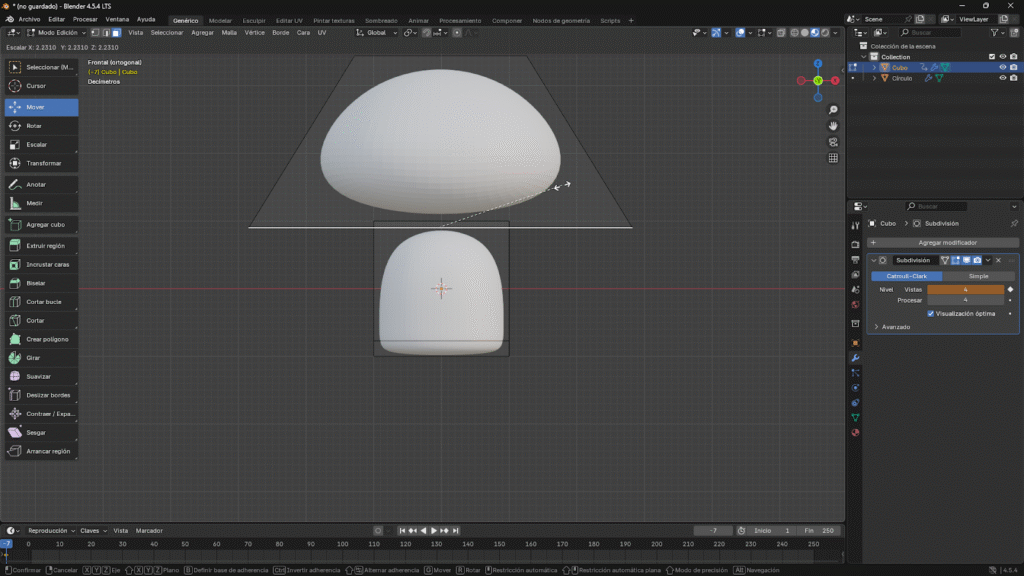 Aplicamos Subdivisión y también ajustamos la escala a la parte superior