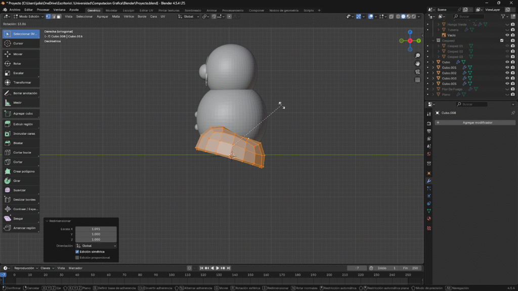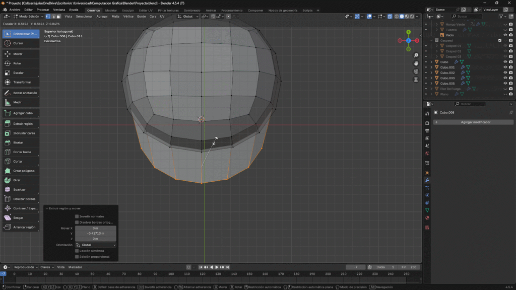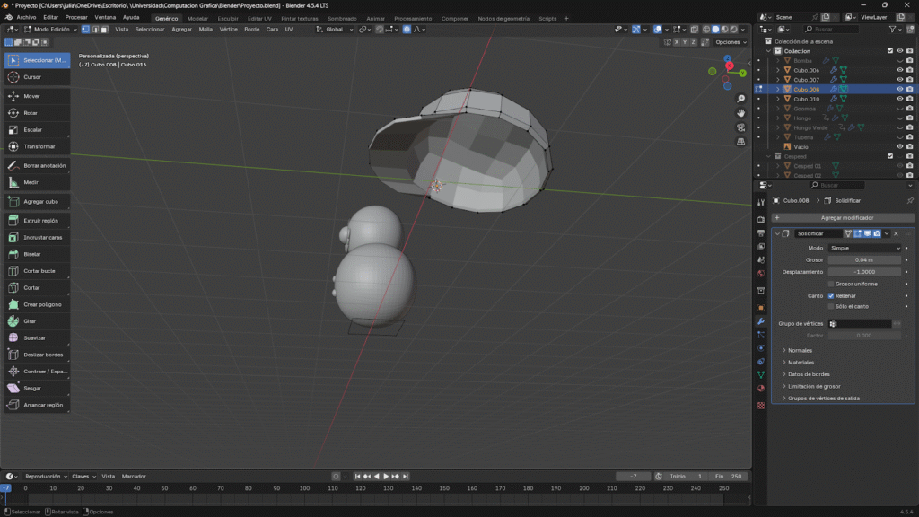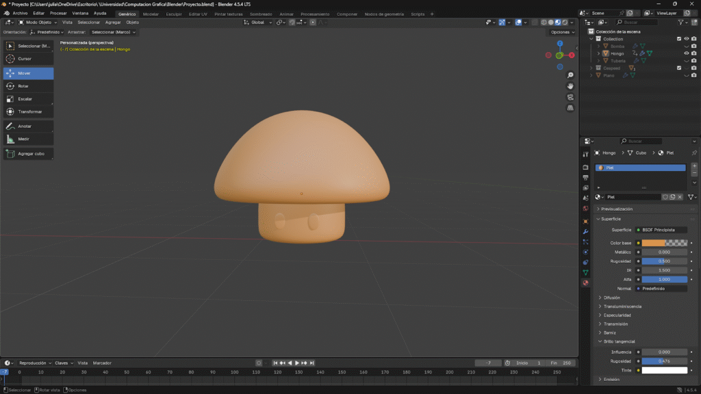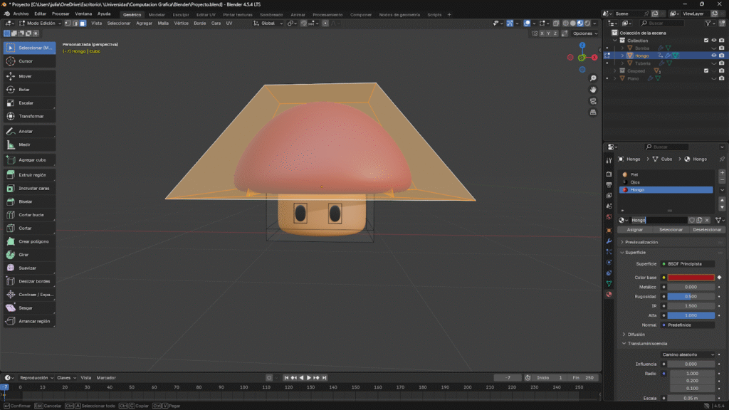 Luego con I creamos el espacio para que encaje la cara del Hongo, con G + Z movemos en el eje Z para ajustarlo y que quede de esta manera