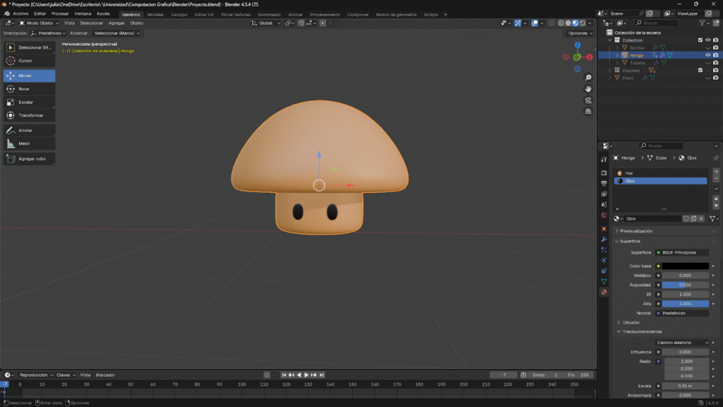Ajustamos la posición de la cabeza del hongo, y creamos dos cubos para los ojos