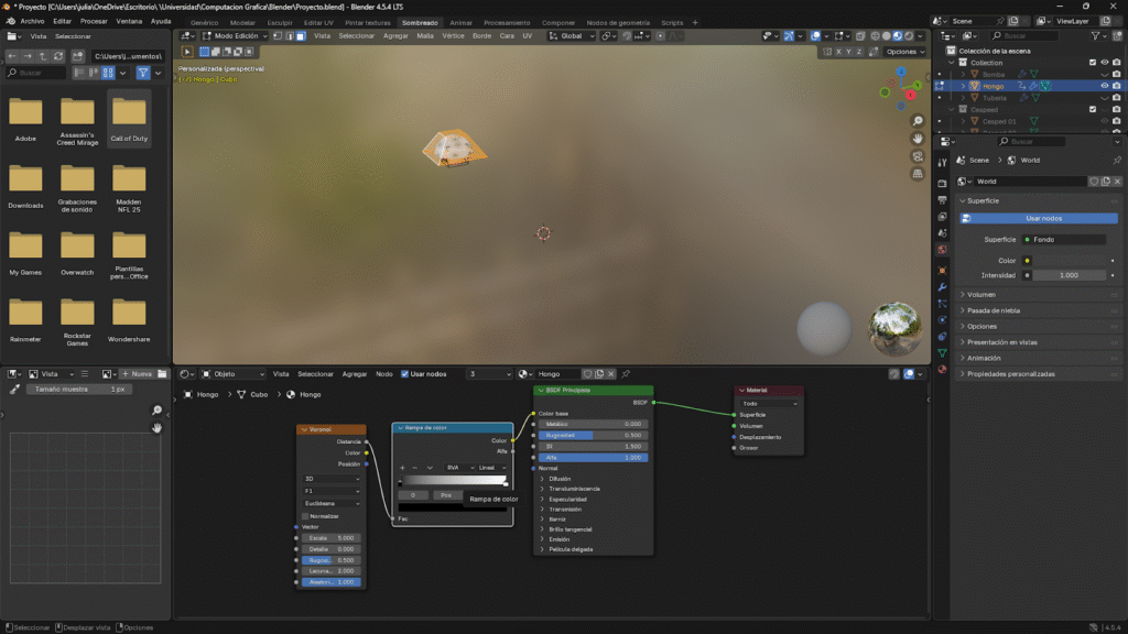 Vamos a la opción de Sombreado de la parte de arriba, acá buscamos “Voronoi” y “Rampa de Color” los conectamos