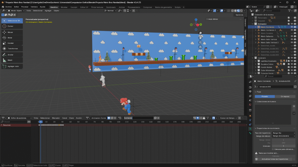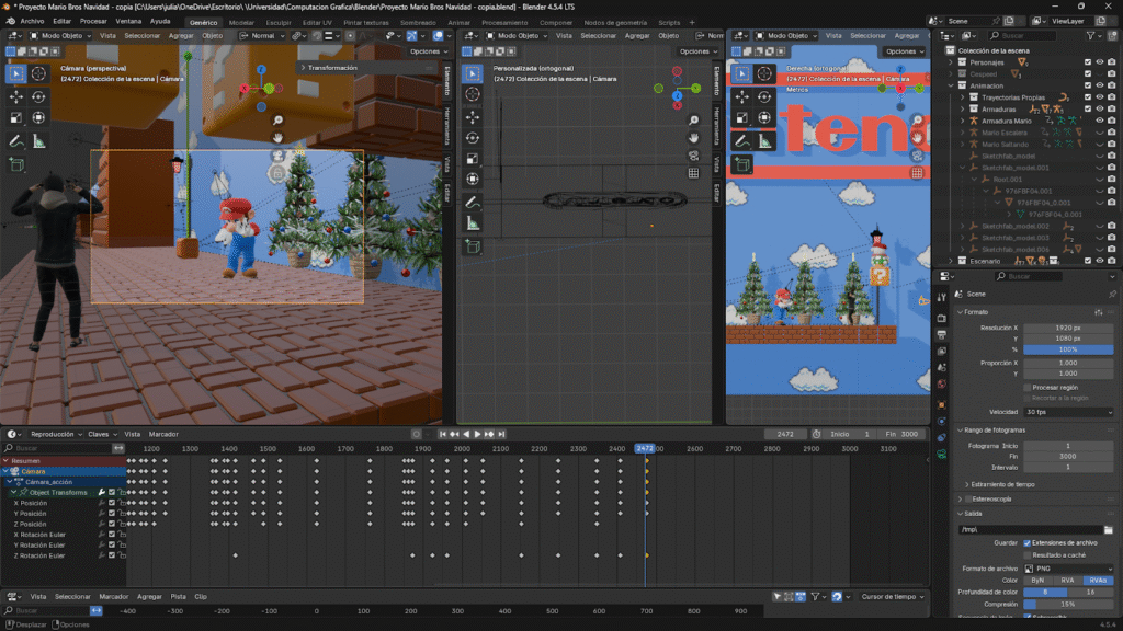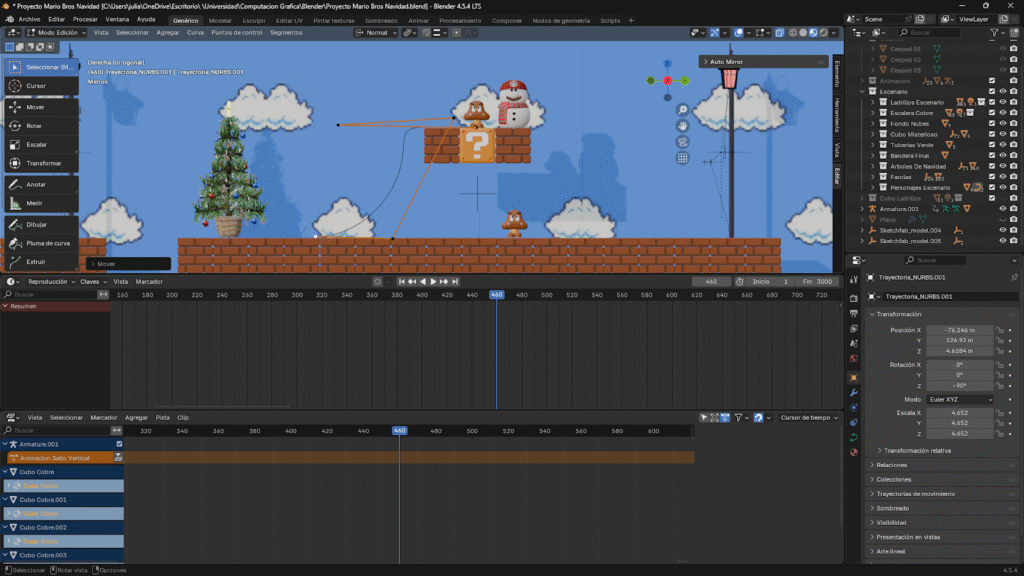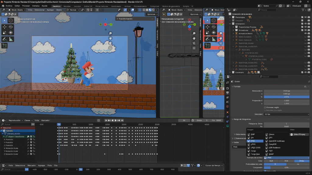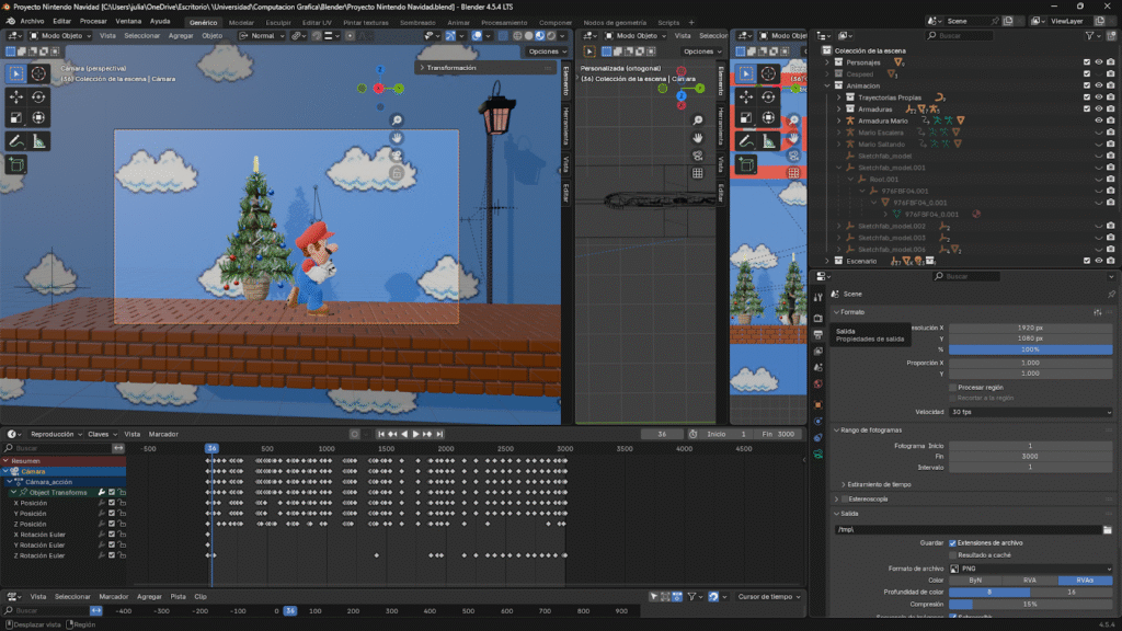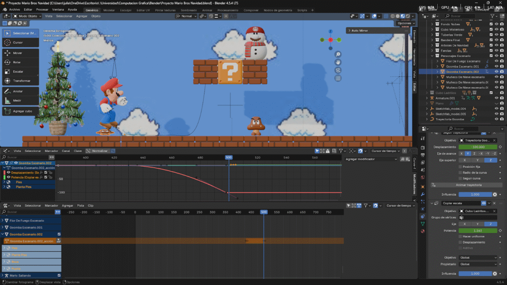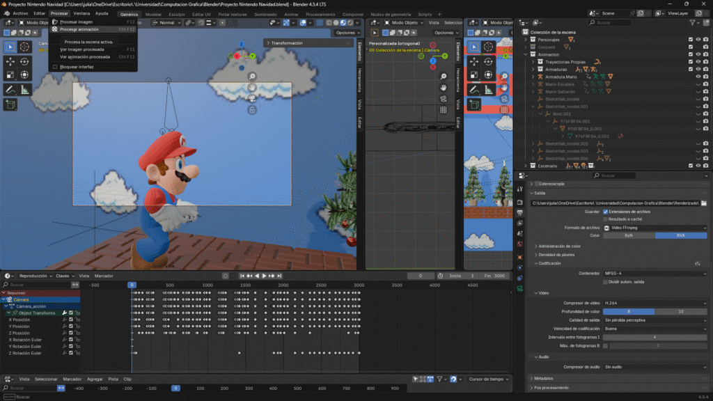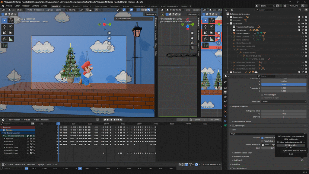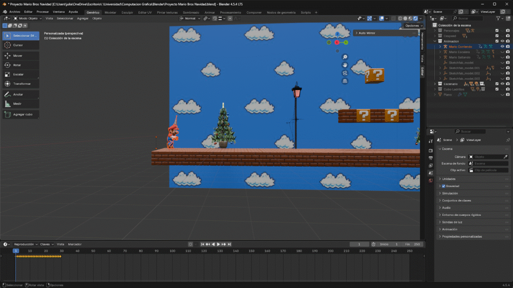La creación de una animación en Blender es siempre una oportunidad para explorar nuevas ideas visuales y técnicas, y en este proyecto decidí combinar dos elementos que transmiten creatividad y nostalgia: la Navidad y el estilo clásico de Nintendo. A través del modelado, las texturas, la iluminación y el renderizado, esta animación busca capturar la magia de una escena navideña mientras mantiene el encanto colorido y simplificado del universo de Mario y otros personajes icónicos. El resultado es una pieza dinámica y llena de vida que refleja tanto el espíritu festivo como el potencial artístico que ofrece Blender.