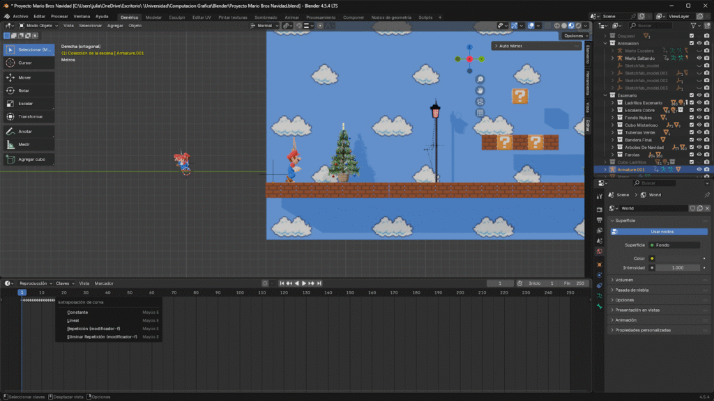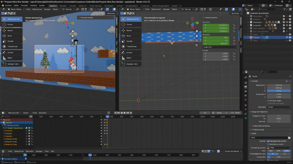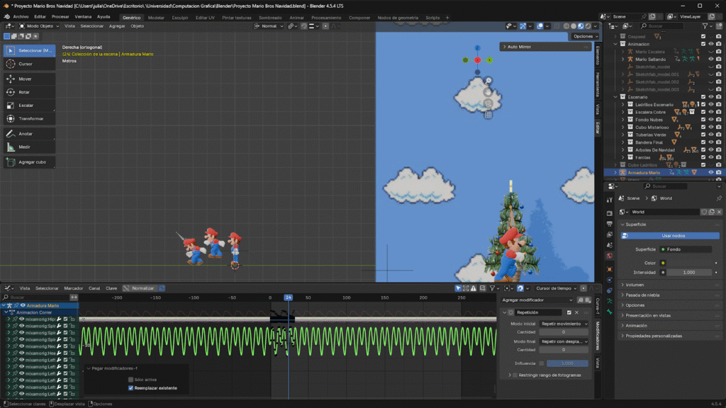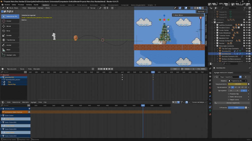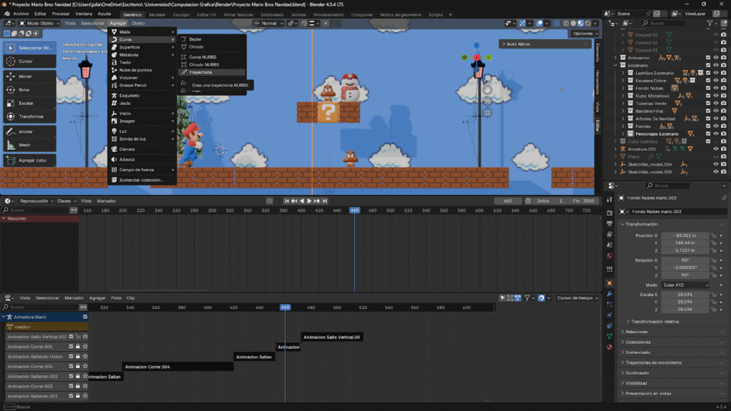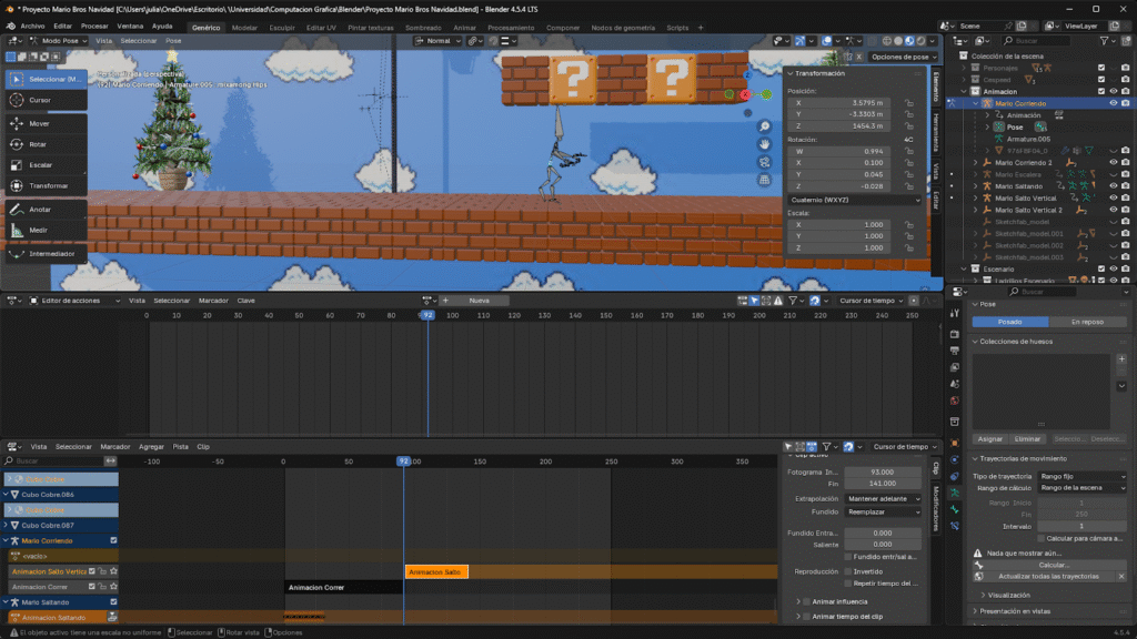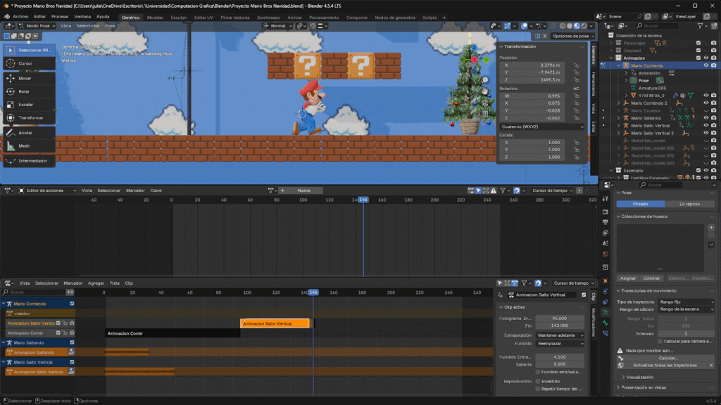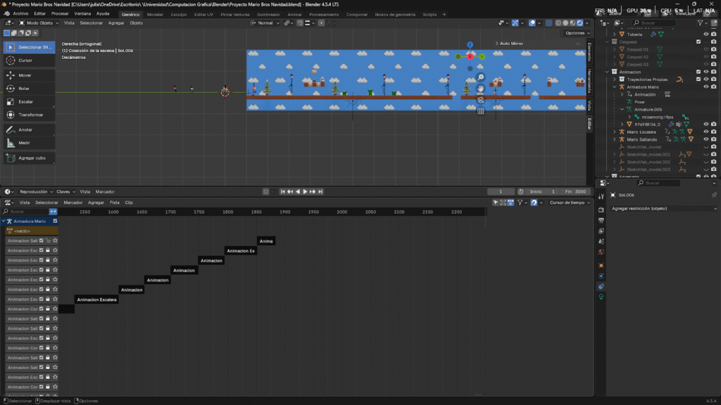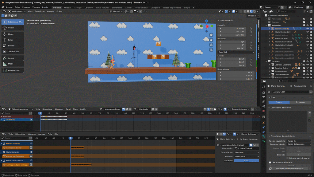 La creación de una animación en Blender es siempre una oportunidad para explorar nuevas ideas visuales y técnicas, y en este proyecto decidí combinar dos elementos que transmiten creatividad y nostalgia: la Navidad y el estilo clásico de Nintendo. A través del modelado, las texturas, la iluminación y el renderizado, esta animación busca capturar la magia de una escena navideña mientras mantiene el encanto colorido y simplificado del universo de Mario y otros personajes icónicos. El resultado es una pieza dinámica y llena de vida que refleja tanto el espíritu festivo como el potencial artístico que ofrece Blender.