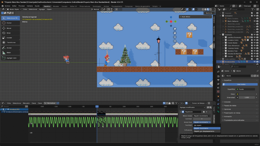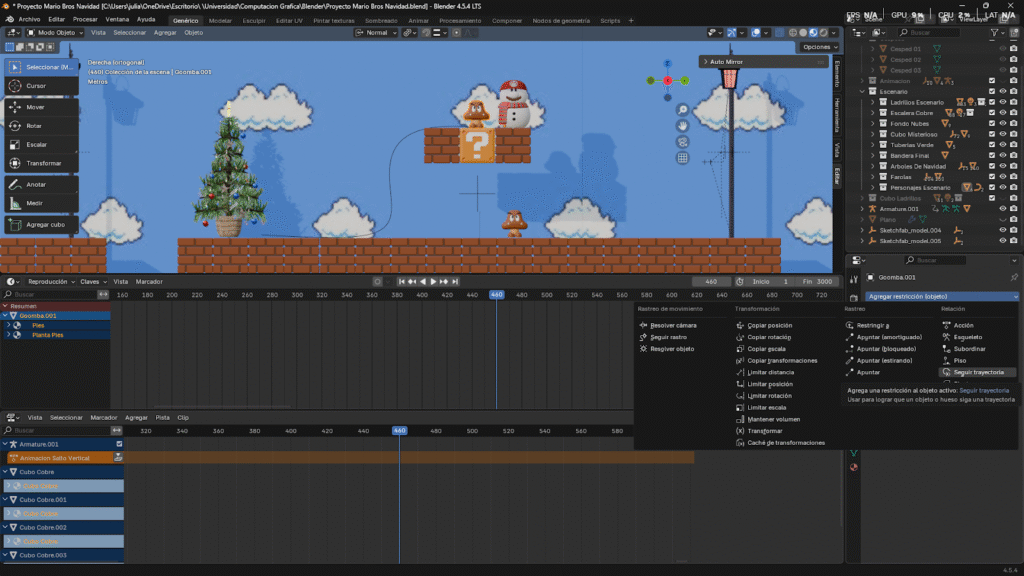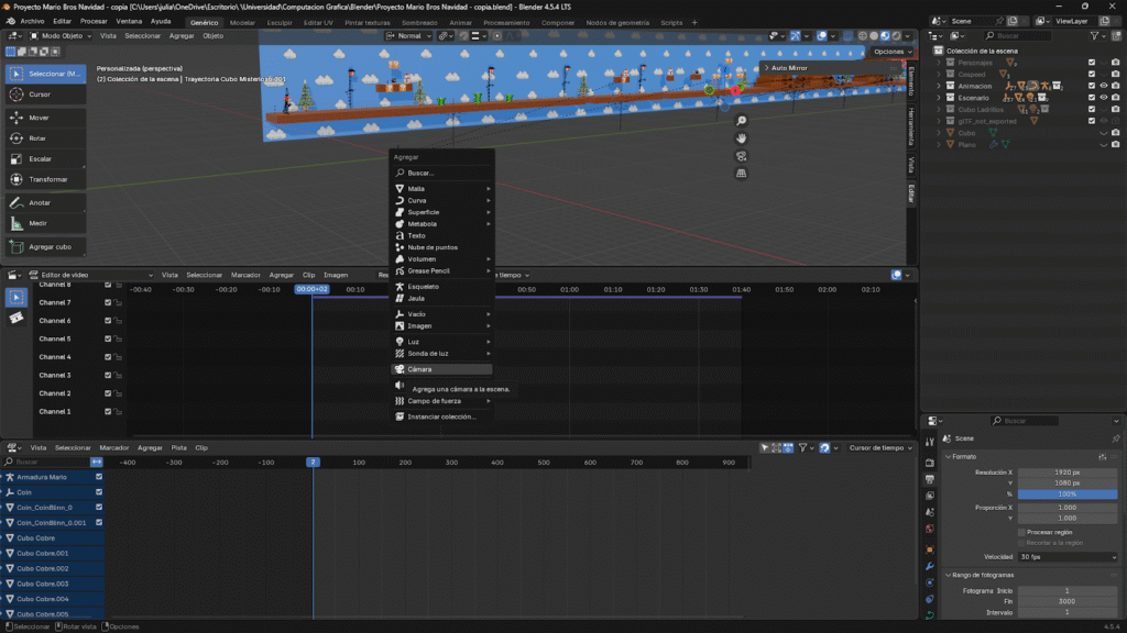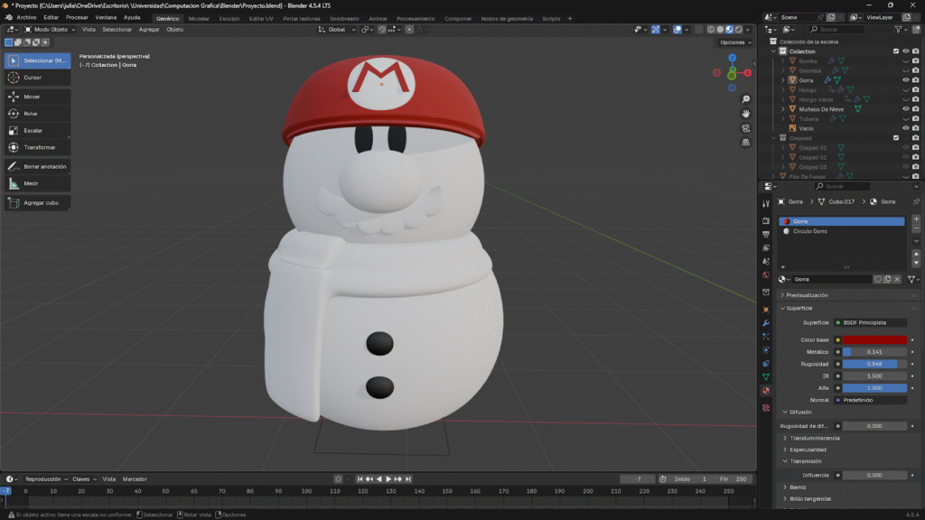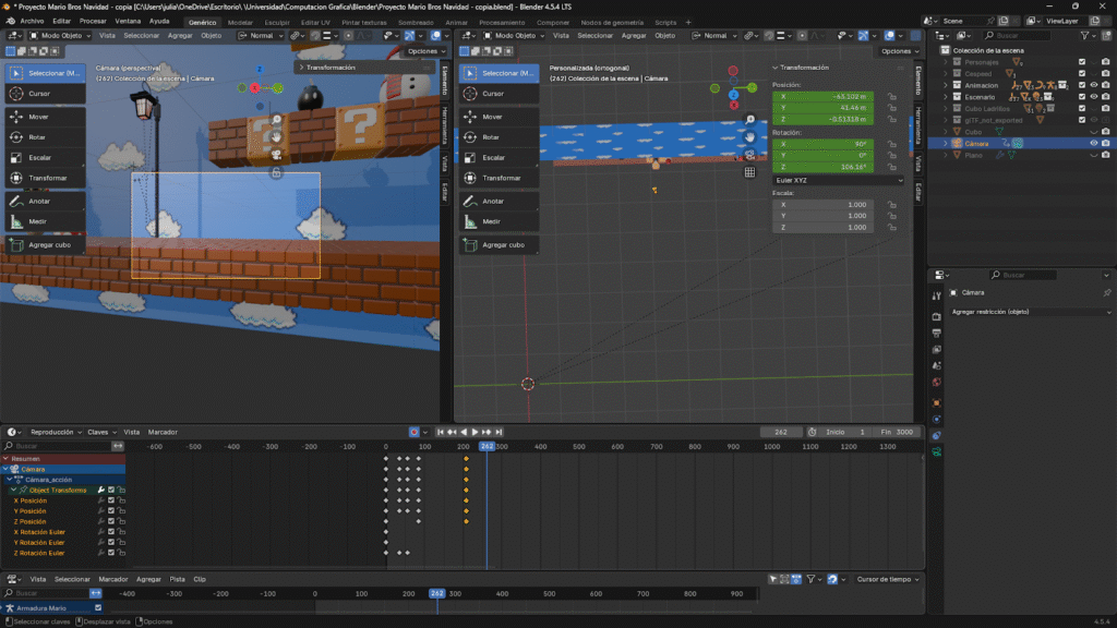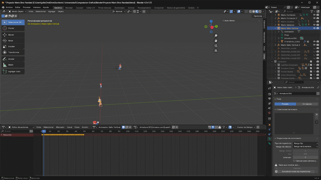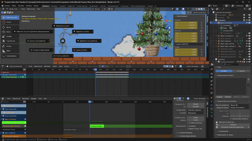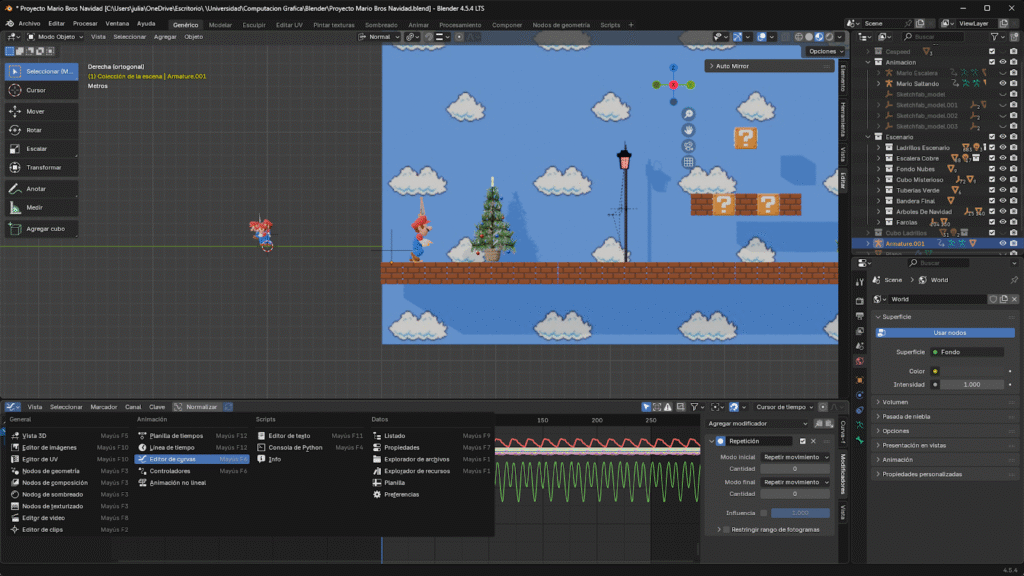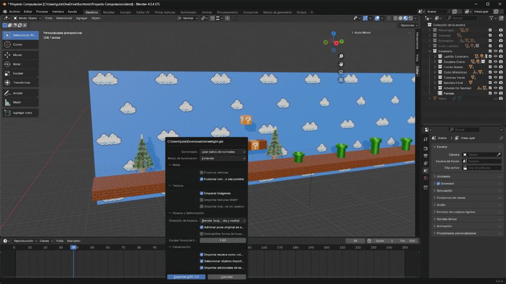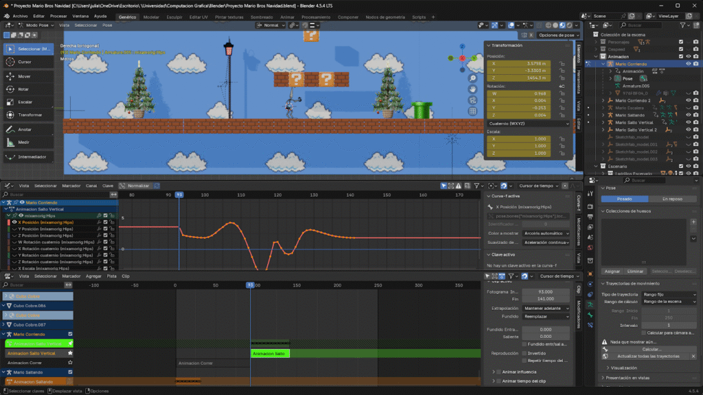 La creación de una animación en Blender es siempre una oportunidad para explorar nuevas ideas visuales y técnicas, y en este proyecto decidí combinar dos elementos que transmiten creatividad y nostalgia: la Navidad y el estilo clásico de Nintendo. A través del modelado, las texturas, la iluminación y el renderizado, esta animación busca capturar la magia de una escena navideña mientras mantiene el encanto colorido y simplificado del universo de Mario y otros personajes icónicos. El resultado es una pieza dinámica y llena de vida que refleja tanto el espíritu festivo como el potencial artístico que ofrece Blender.