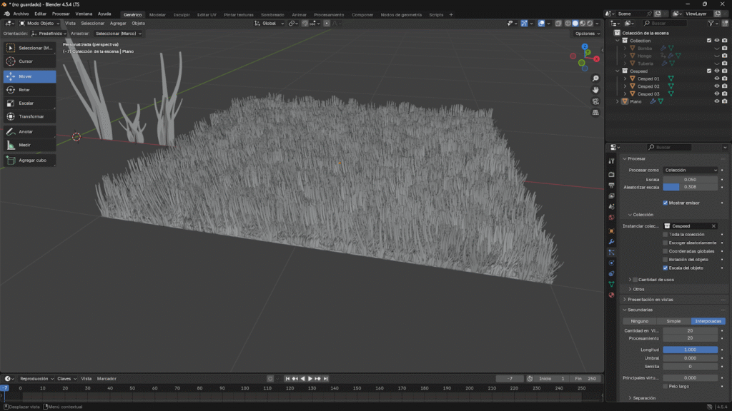 Ajustamos algunos parámetros como “Rotación”, “Aleatorizar Rotación”, “Aleatorizar escala” y la opción “Secundarias” la dejamos en “Interpoladas” quedando así