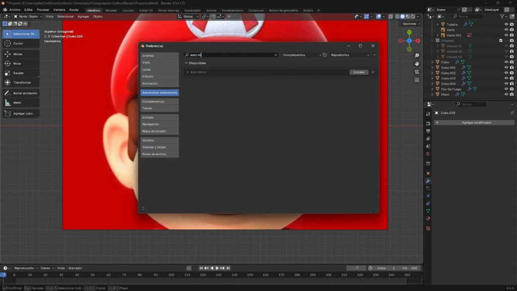 Seleccionamos el cubo, vamos a “Editar”, “Preferencias” “Administrar extensiones” y buscamos “Auto Mirror” instalamos