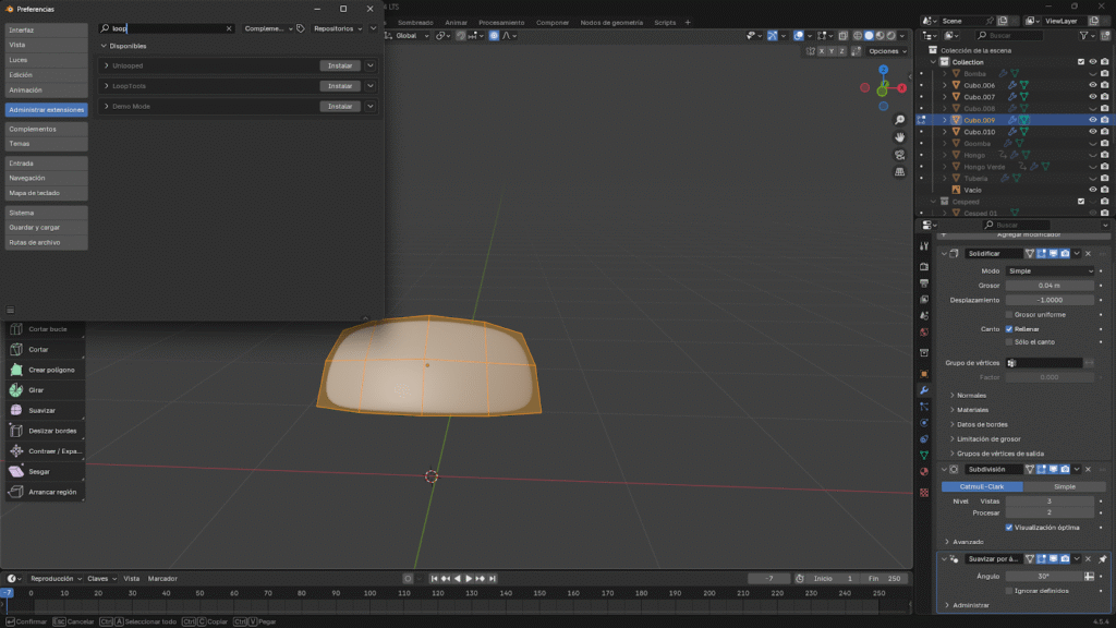 Duplicamos la parte del frente de la gorra y en “Preferencias” añadimos “LoopTools”