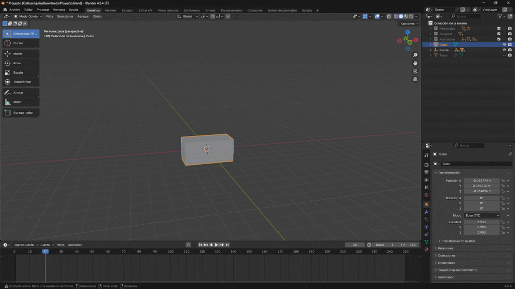 luego creamos un nuevo cubo, de este seleccionamos la cara de abajo y con S lo escalamos quedando así