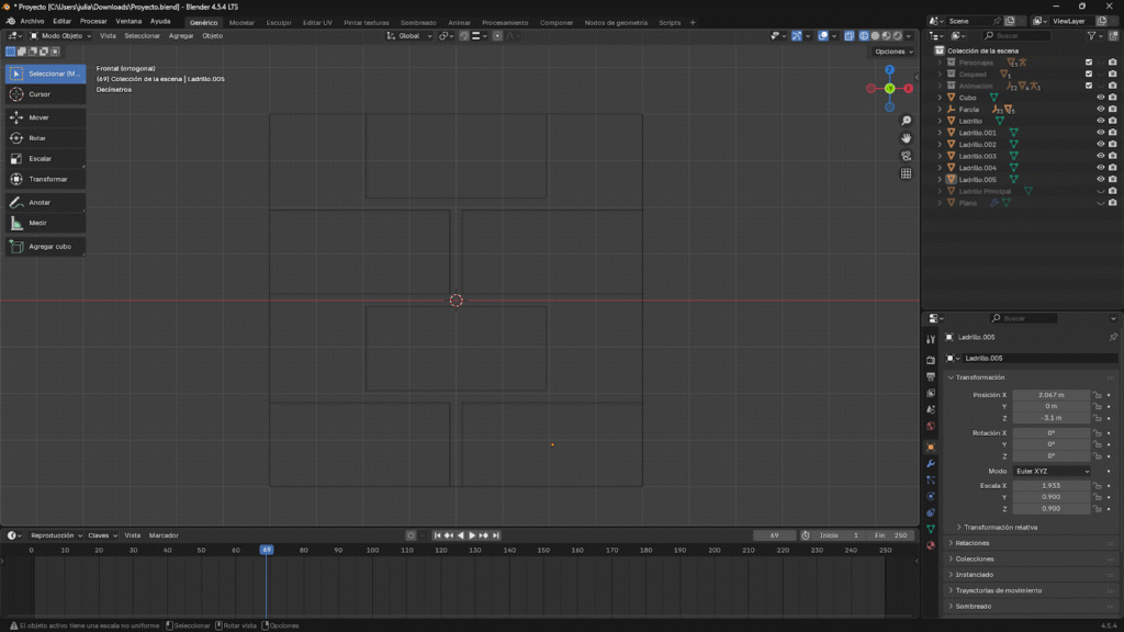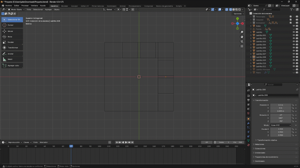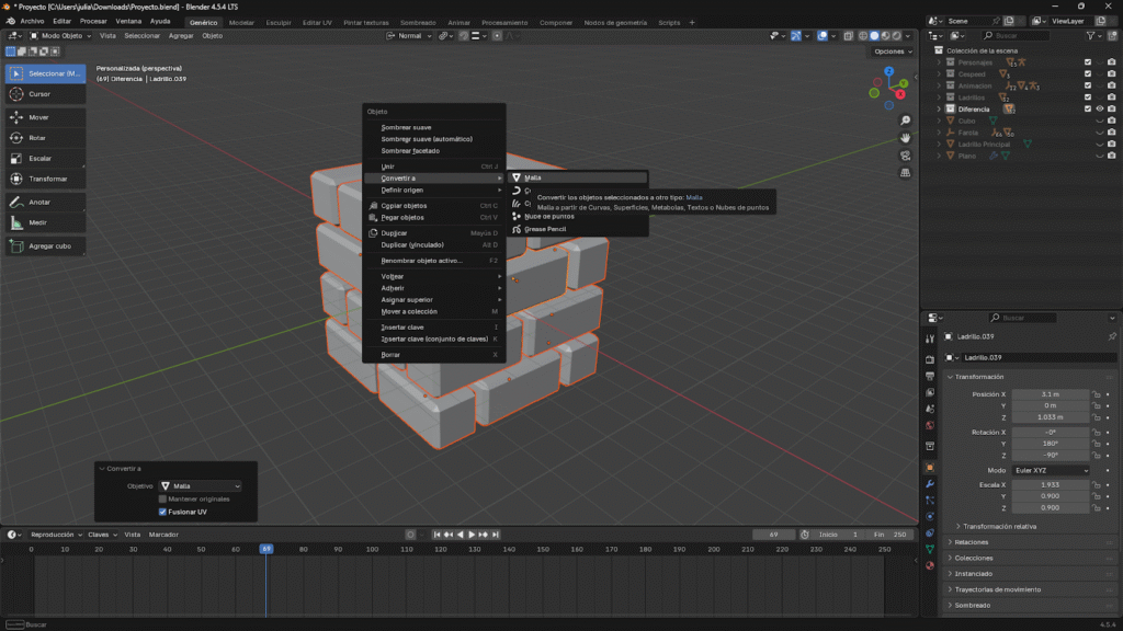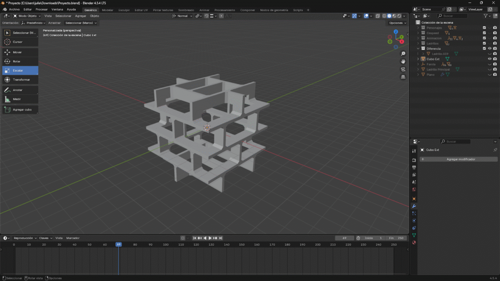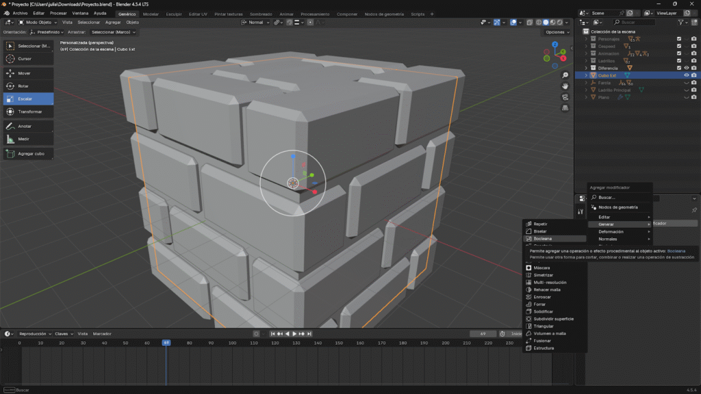 Al cubo le agregamos un modificador Booleana y seleccionamos la colección de ladrillos 2