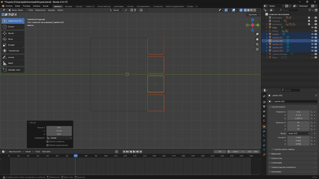 Con la vista 3, movemos todos los ladrillos a un lado del cubo