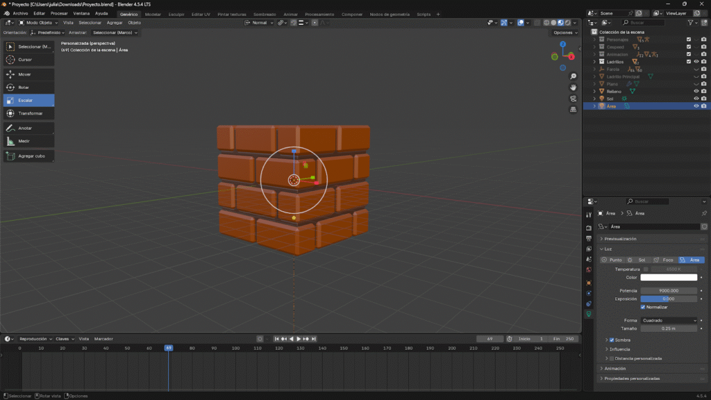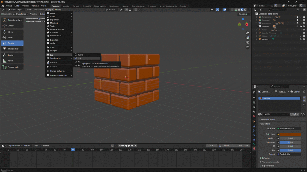 Seleccionamos el uno de los ladrillos y le aplicamos un color café más claro