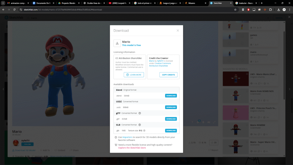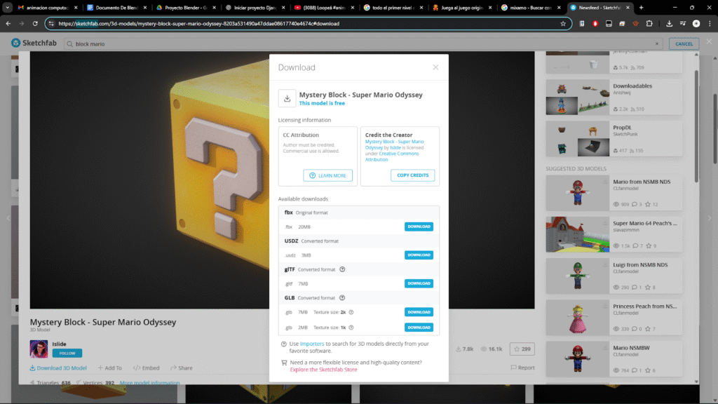 Buscamos el modelo que nos guste en Sketchfab y lo descargamos en formato glb