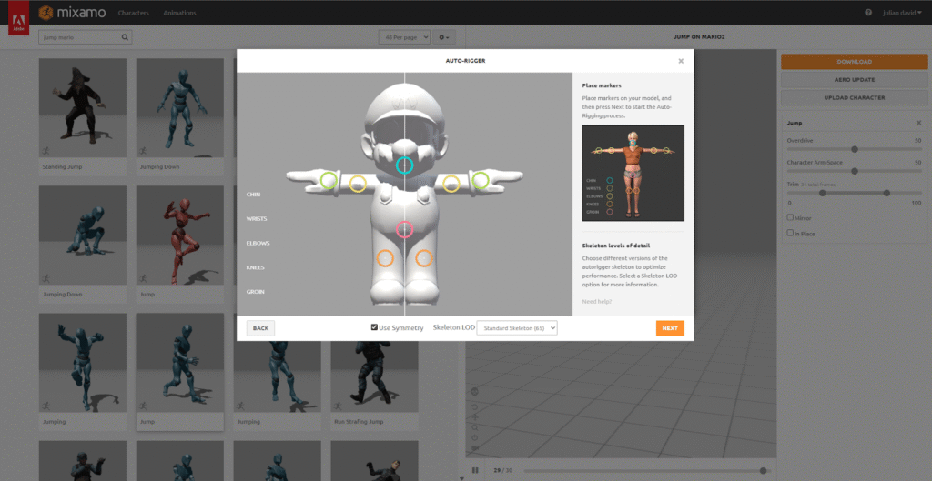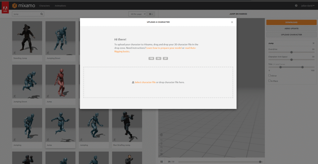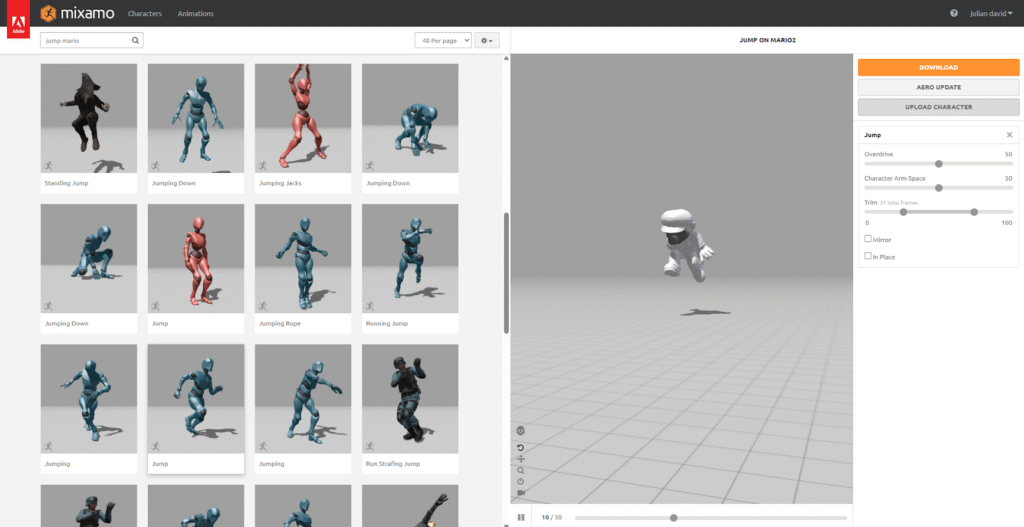 Y con esto ya podríamos poner cualquier animación al personaje, seleccionamos la que más nos guste, y lo descargamos.