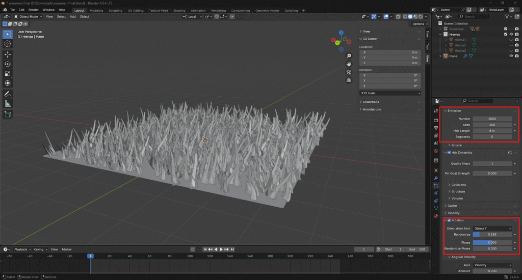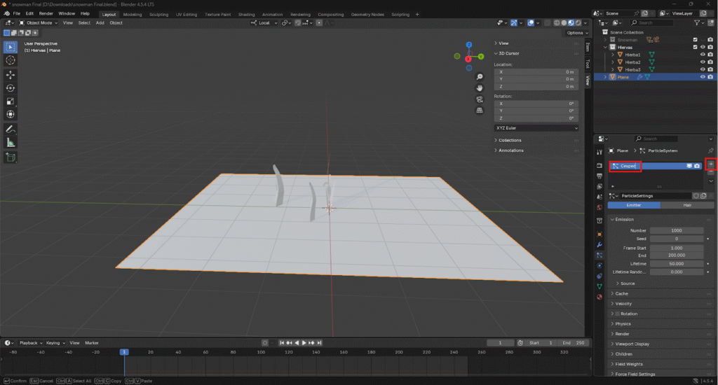 Desde el panel de propiedades asignamos la colección de hiervas como fuente de creación de las partículas