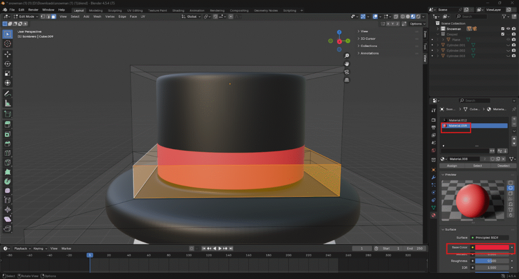 Seleccionamos todo el sombrero y le aplicamos un nuevo material y le asignamos el color negro