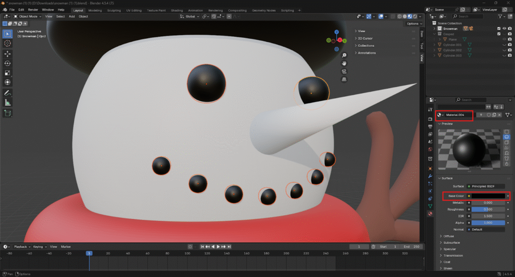 En los ojos y sonrisa se seleccionan y se le pueden asignar el mismo material color negro del sombrero
