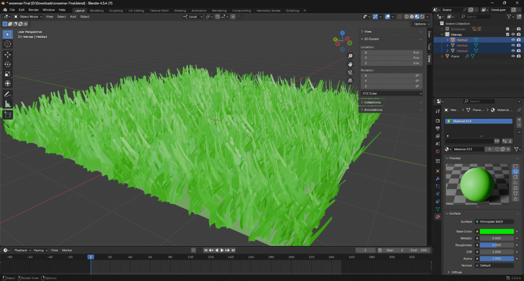 Para darle color a las hojas vamos a seleccionar las hojas que están en la colección de hiervas y vamos a darles un nuevo material