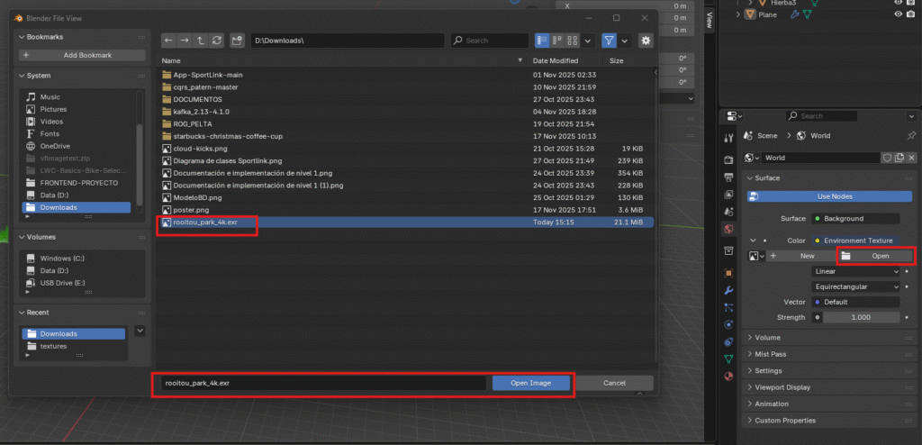 Volviendo a Blender en las propiedades del mundo seleccionamos de recurso el archivo descargado en el paso anterior