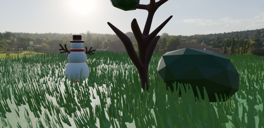 Para el escenario se agregaron detalles como el árbol y el arbusto, un sistema de nieve hechos de manera propia.