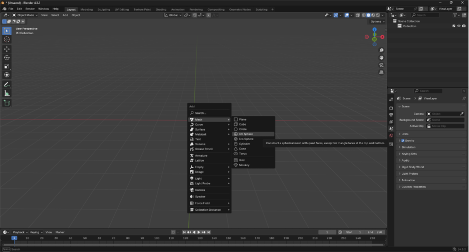Para crear una esfera en blender, se usa el comando Shift+A, que despliega un menú, dónde se debe usar el que dice Mesh, allí seleccionamos la figura que ente caso es UV Sphere (Esfera). Esto se puede apreciar en la siguiente Figura.