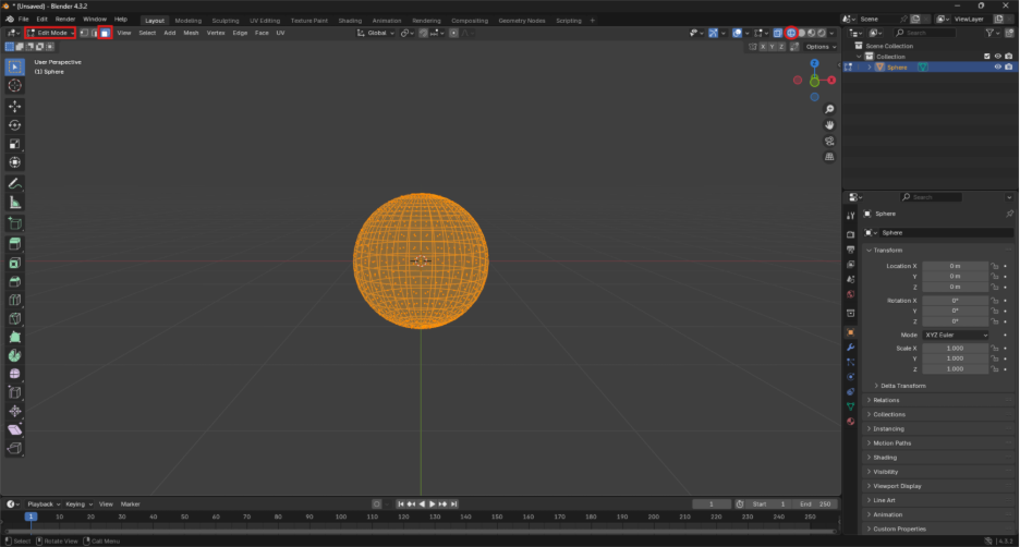 Ya teniendo la esfera se entra en el modo edición con la tecla Tab o en la parte superior izquierda y se usa Wireframe(estructura) en el Viewport Shading (sombreado de la vista), por último selecicionar la opción de Face Select (Seleccion de caras) en la parte superor izquierda o con la tecla número 1 del teclado. Acontinuación se representarán en la siguiente Figura.
