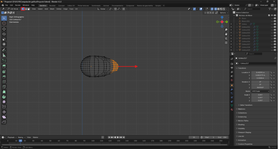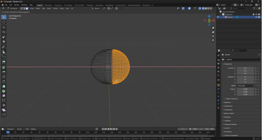Ya teniendo la figura como se muestra en la figura 2, se selecciona la mitad de uno de los lados de la esfera y a continuación se usa la letra G y luego la letra del eje sobre el que está la esfera, en este caso X y se mueve el mouse buscando alejar los vértices d su origen hasta formar una esfera alrgada como se ve en la figura a continuación.