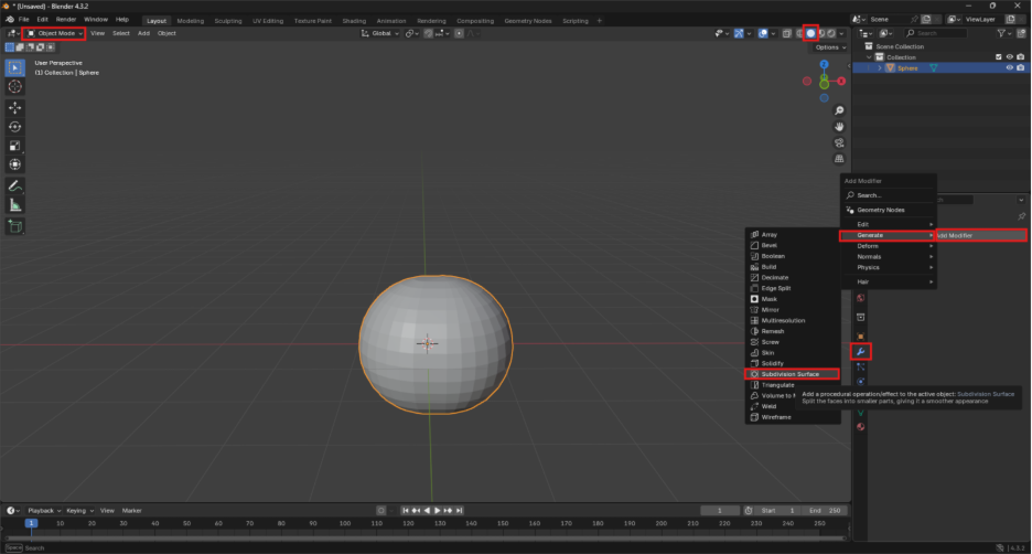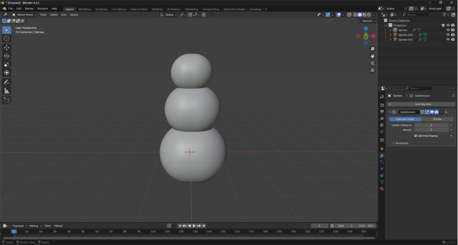 Seguido a esto, se vuelve al Objet Mode con la tecla Tab y en el Viewport Shading (sombreado de la vista) se usa Solid, luego en la parte derecha buscar la opción de Modifiers y en Add Modifier se busca Generate y Subdivision Surface, allí se abre un menú dónde se ajusta el Levels Viewport, el cual si se aumenta hará que se vea más pulida la esfera. Se deben hacer dos copias, para obtener 3 esferas apiladas pero cada vez más pequeña la que esté más arriba hasta lograr el resultado de las dos Figuras a continuación.
