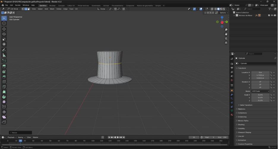 Para crear el sombrero se usan don cilindros y para los brazos 3. el primer cilindro se deja muy delgado y el otro encima. Para hacer el cilindro delgado se selecciona la cara superior y con la letra G y la letra Z deplazamos verticalmente hacia abajo hasta lograr el resultado de la Figura: