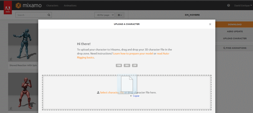 Para agregarla alguna animación arrastramos el fbx creado a la página de Mixamo. Como se ve a continuación: